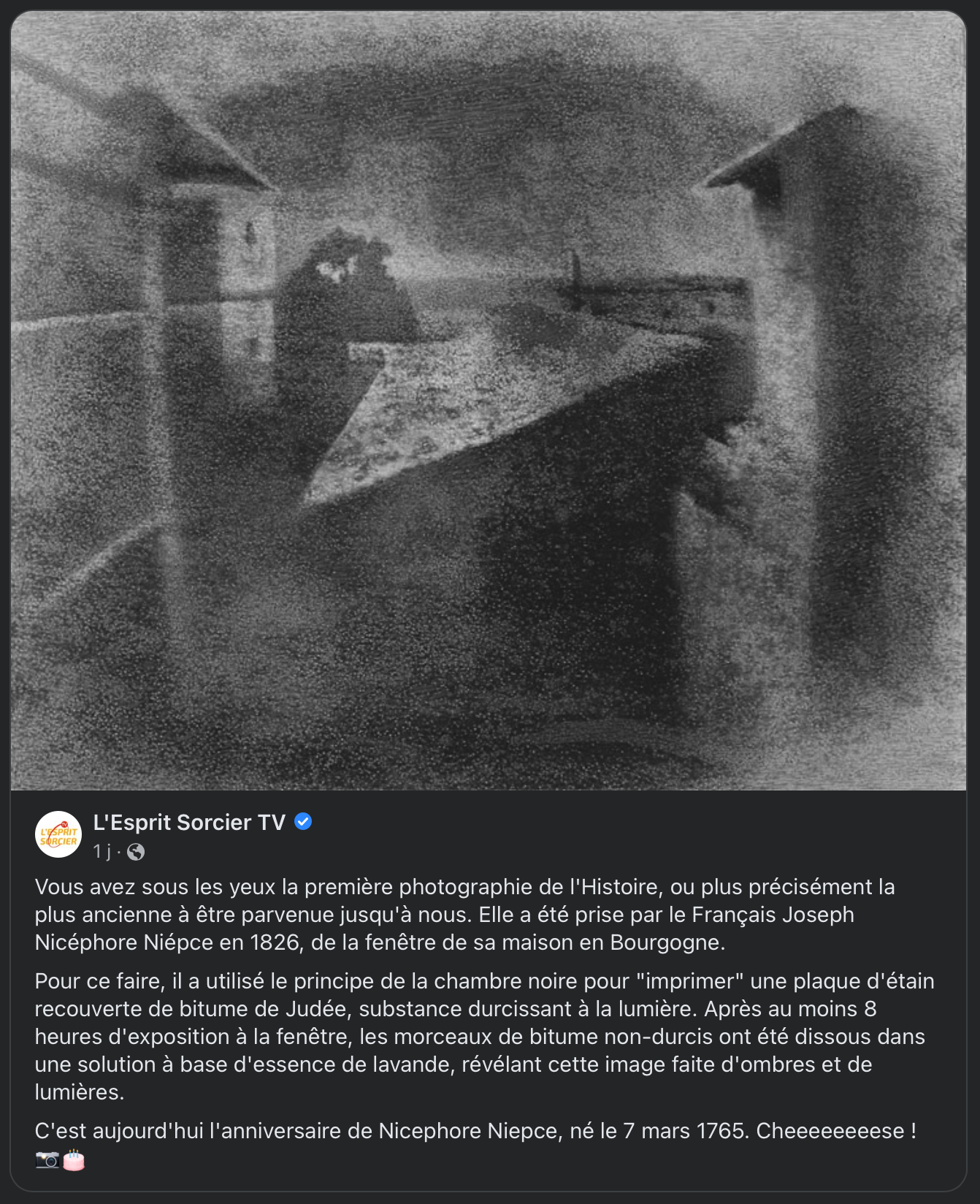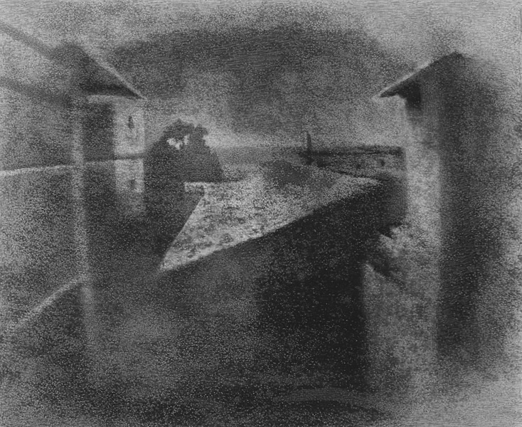 Pour l'anniversaire de Nicéphore Nièce, rappel de la première photo de l'histoire (1826), prise vers Chalon-sur-Saône. 8 h de pose quand même à l'époque !