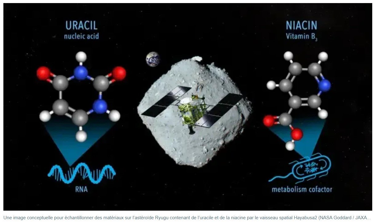 Les chercheurs ont analysé des échantillons de l’astéroïde Ryugu collectés par le vaisseau spatial Hayabusa2 de l’Agence spatiale japonaise et ont trouvé de l’uracile, l’une des unités d’information qui composent l’ARN, les molécules qui contiennent les instructions sur la façon de construire et de faire fonctionner les organismes vivants. L’acide nicotinique, également connu sous le nom de vitamine B3 ou niacine, qui est un cofacteur important pour le métabolisme dans les organismes vivants, a également été détecté dans les mêmes échantillons.
