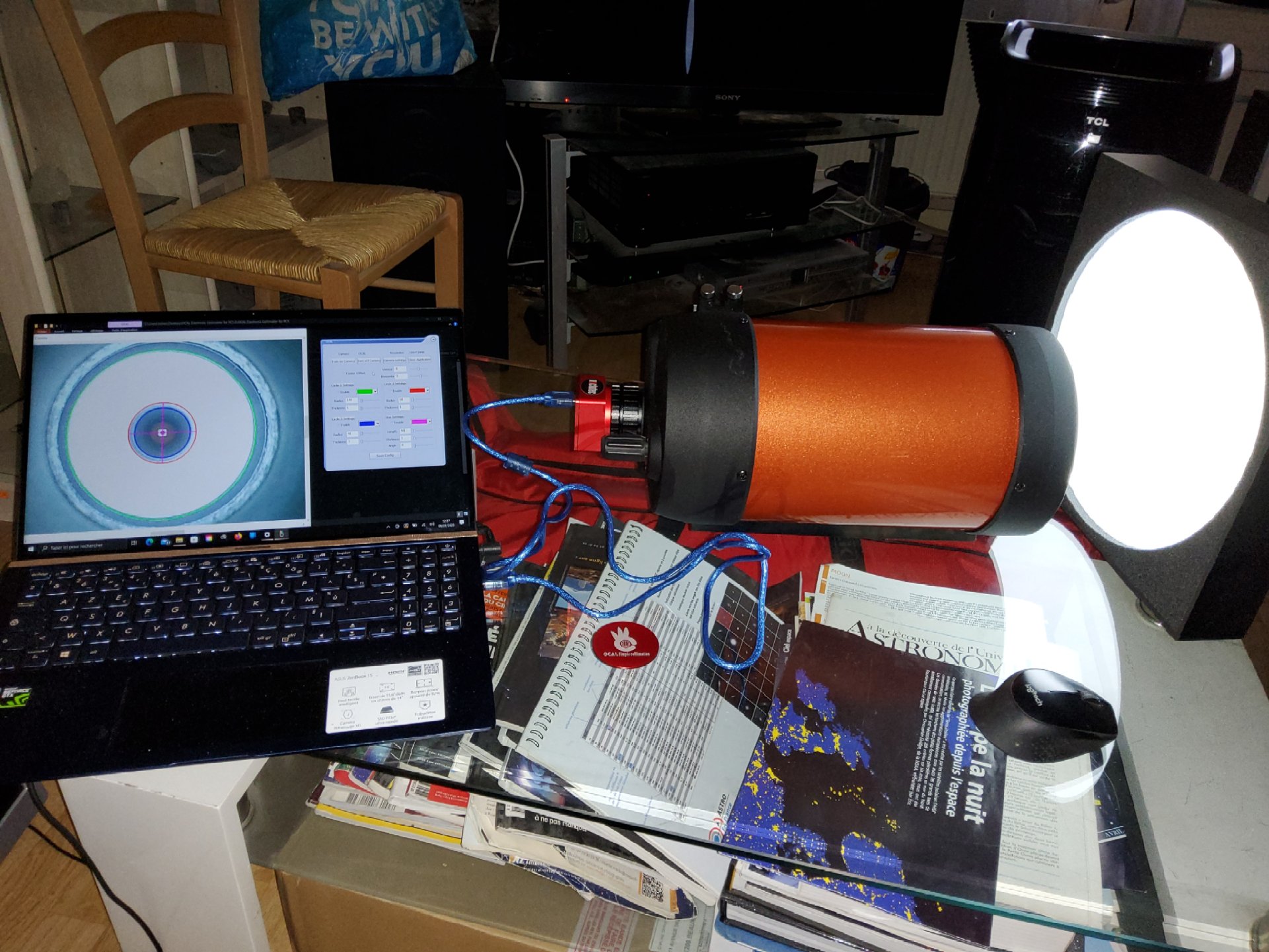 Voici un outil très utile pour régler l’optique d’un télescope. Il s’agit de la caméra Ocal Electronic collimator. Je l’ai utilisé sur mon newton et mon schmidt cassegrain et ça marche plutôt bien. Le gros inconvénient c’est le prix qui est un peu élevé mais je trouve pratique de pouvoir collimater son tube optique chez soi et en plein jour.