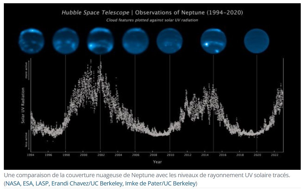 Des chercheurs dirigés par Erandi Chavez utilisant les données du télescope spatial Hubble et des observatoires Keck et Lick, ont découvert que la quantité de couverture nuageuse sur Neptune fluctue sur des cycles d’environ 11 ans, et semblent être synchronisés avec l’activité solaire.