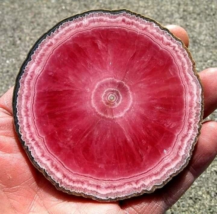 Cette belle pierre est une Rhodochrosite (https://fr.wikipedia.org/wiki/Rhodochrosite=) MnCO3 + quelques traces d'éléments métalliques.