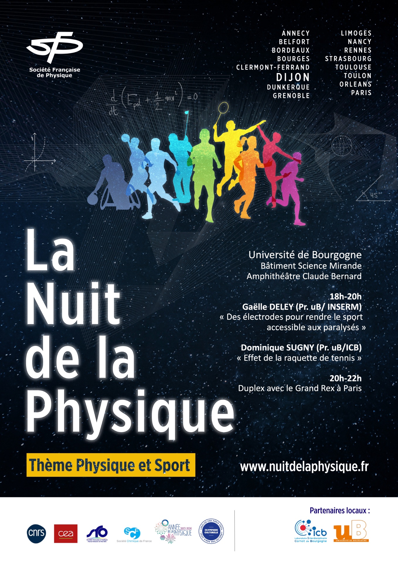 La Nuit de la Physique : « Physique et Sport » se tiendra le mardi 2 avril prochain à l’amphithéâtre Claude Bernard (Sciences Mirande, uB) de 18h à 22h30 : https://www.sfpnet.fr/nuit-de-la-physiq ... rt-a-dijon.