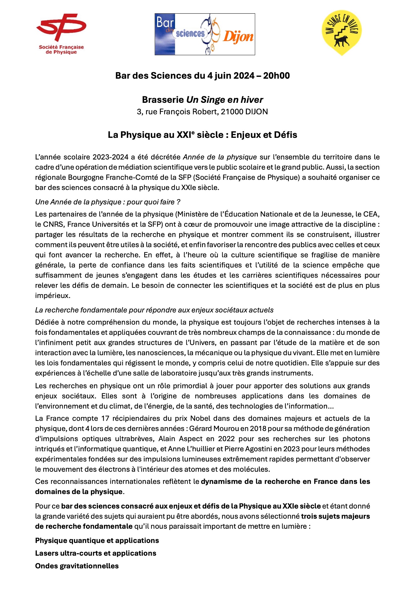 Mardi 4 juin à 20h, un Bar des Sciences passionnant sur la physique d'aujourd'hui à Un Singe en Hiver - Fabrique de bières et de curiosité avec la Société Française de Physique !
