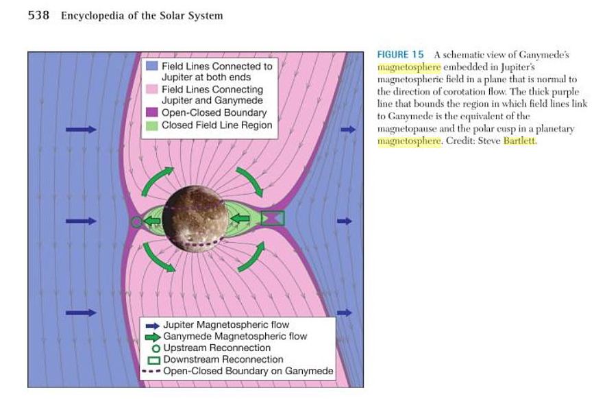 Pour Isabelle, parce que j'aime bien lui parler de cette curiosité-là, un schéma de la magnétosphère de Ganymède, le seul satellite à posséder un champ magnétique dipolaire. Une magnétosphère dans une magnétosphère (celle de Jupiter). C'est tiré de "Encyclopedia of the Solar System" (qui est dans la bibliothèque de la SAB).
