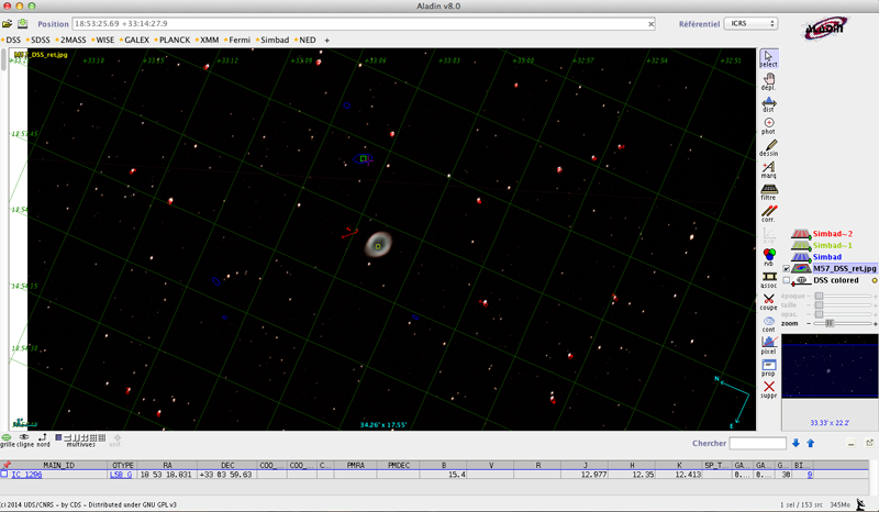 L'excellent logiciel Aladin qui recale vos images dans le ciel (réduction astrométrique) et peut y superposer les catalogues de l'Observatoire Virtuel passe en version 8 :