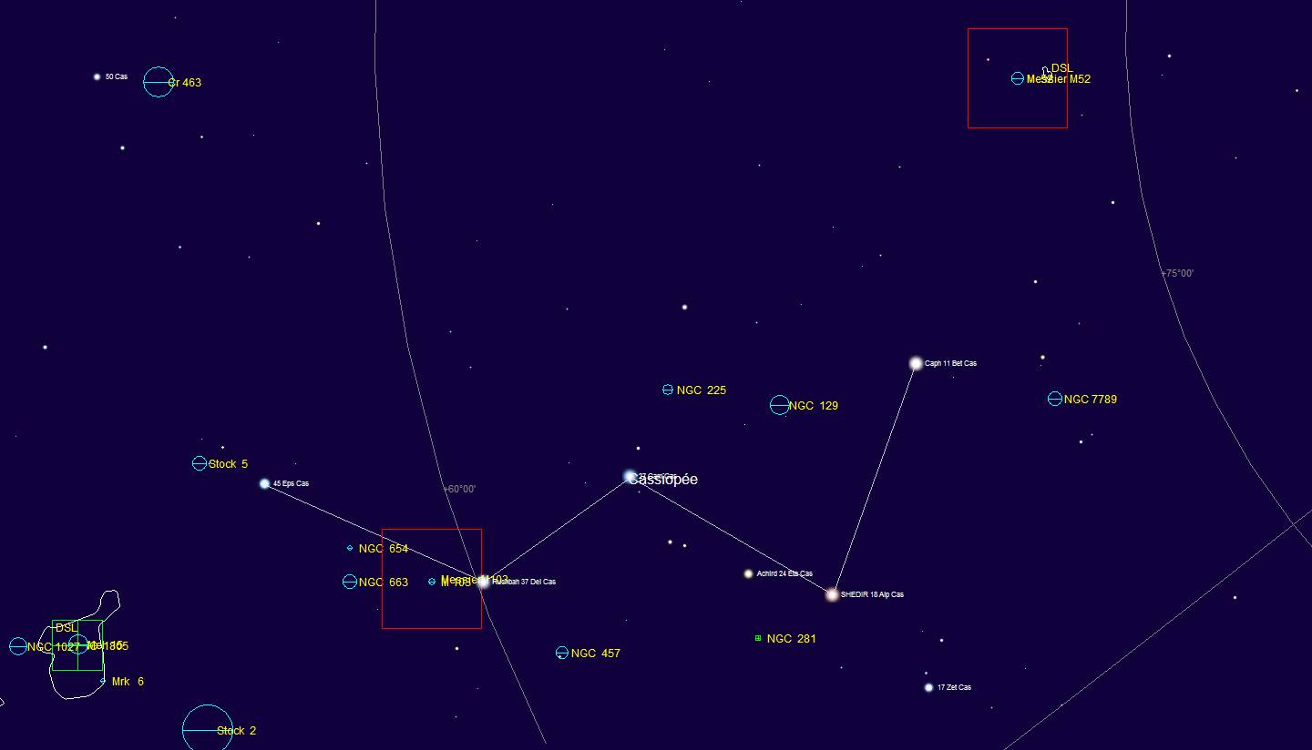 Nous avons donc pris les 7ème et 8ème objets du Marathon : M103 et M52, deux amas ouverts dans Cassiopée, et nous en avons profité pour scruter tous les petits amas ouverts des alentours. Ci-joint une petite carte pour les repérer :