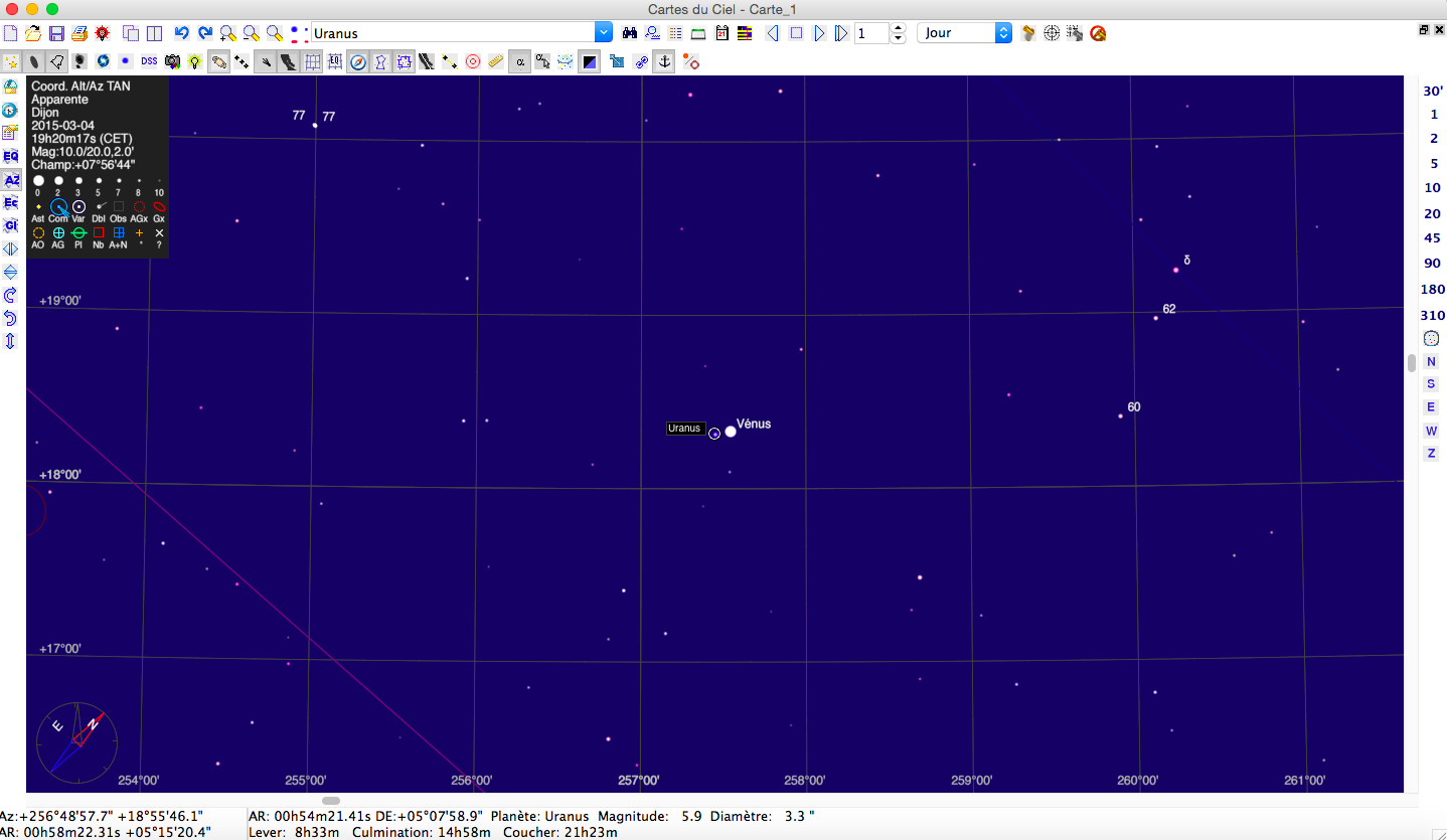 Mercredi 4 mars 2015 en début de soirée (entre 19h et 19h30, disons), nous pourrons observer un nouveau rapprochement planétaire apparent, avec Vénus et Uranus à même pas 10 secondes d'arc. Ca se tente en photo, ça !