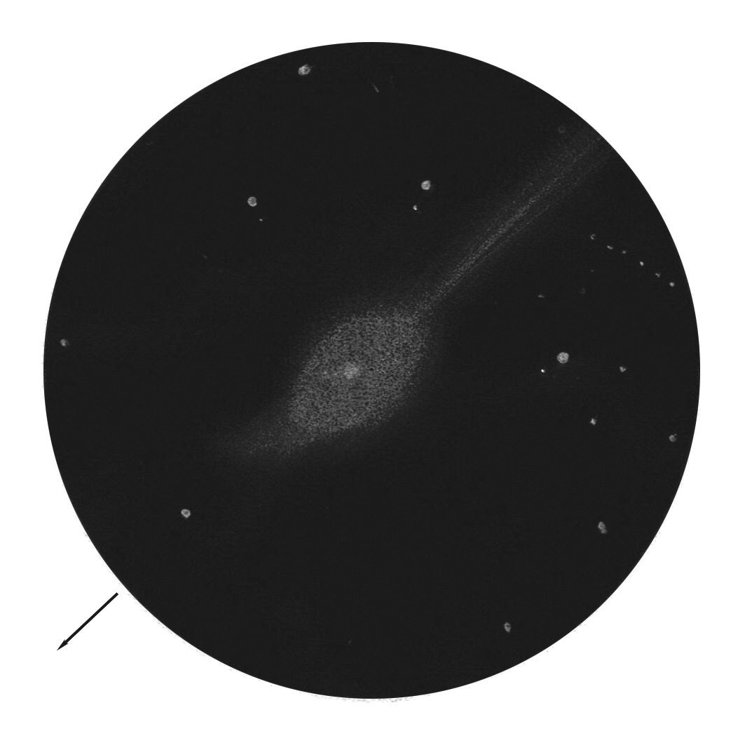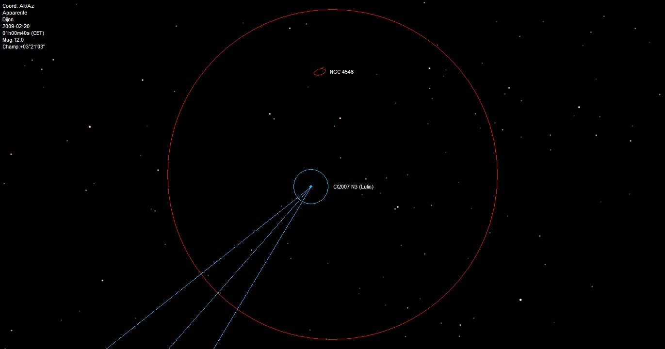 La comète n'est pas tout à fait orientée Est-Ouest. Il a surement raison. Par contre, je pense que les deux queues n'étaient pas tout à fait alignées. Bon, le gars il frime un peu en mettant la galaxie ngc 4546. Bon c'est vrai, elle devait être dans le champ, à magnitude 10,3, et j'ai pas fais gaffe... Mais honnêtement, je préfère mon dessin à moi
