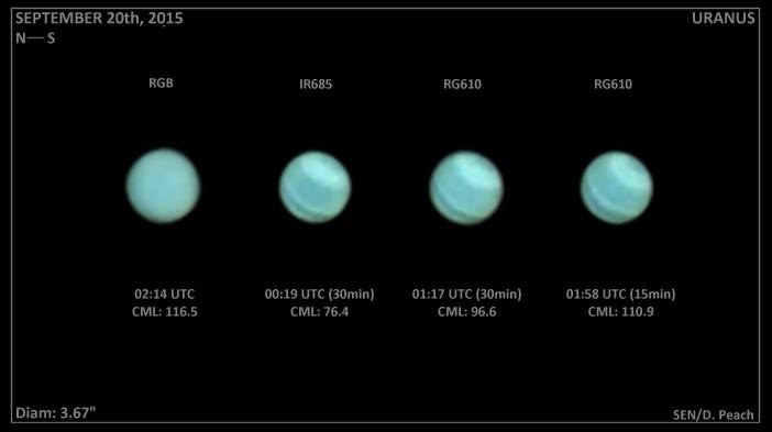 This night presented some steady conditions which allowed a good image of this distant world, along with its largest moon, Triton. A bright feature is seen on the disk (probably a storm feature.)