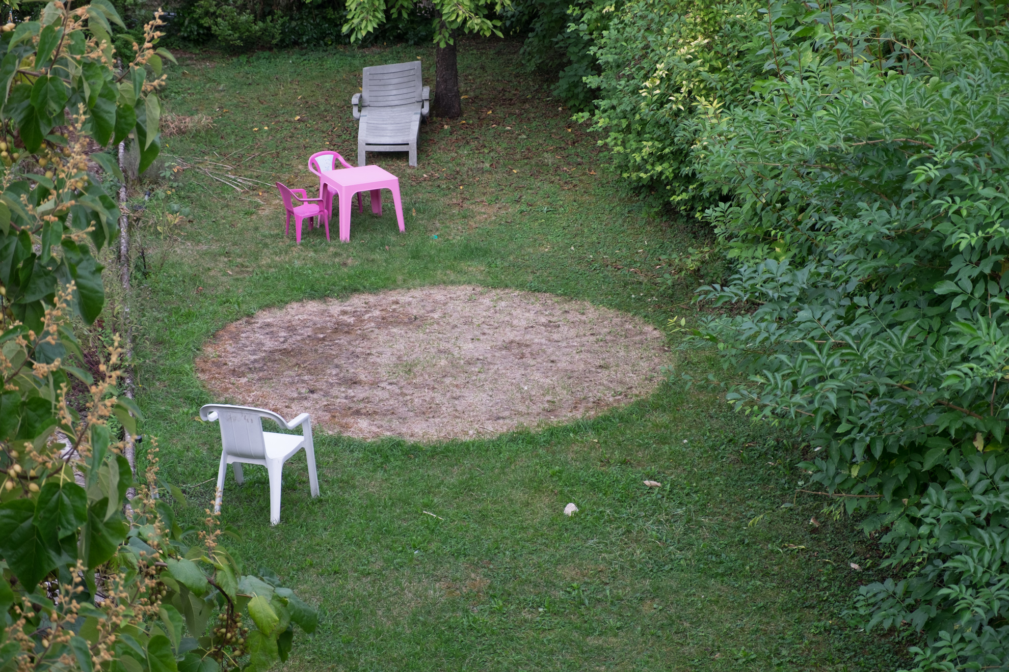 Un cercle parfait, ou pratiquement toute l'herbe est détruite. Il y avait ce matin une drôle d'odeur dans l'air, qui s'est dissipée. Le mobilier de jardin était rangé hier soir, ce matin nous l'avons retrouvé comme sur la photo.