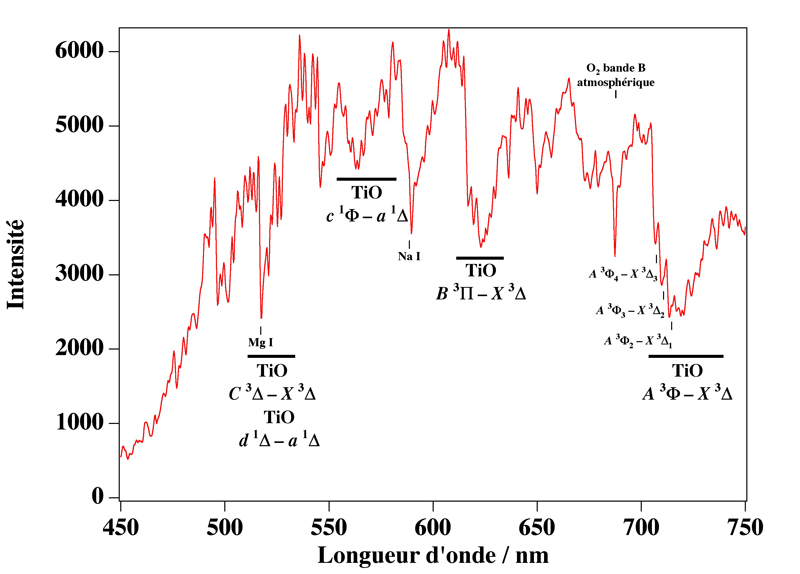 Grâce à quelques recherches bibliographiques et à des collègues spectroscopistes, j'ai commencé à identifier les bandes de TiO dans le spectre de Bételgeuse enregistré l'autre soir (voir http://www.sab-astro.fr/forum/viewtopic.php?f=14&t=2348" onclick="window.open(this.href);return false;).