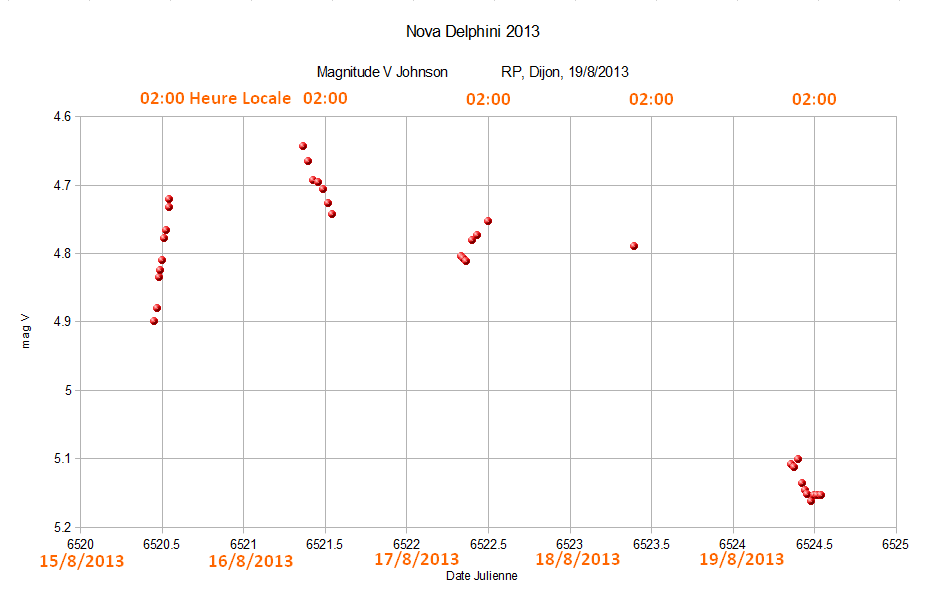 En photométrie on voit aussi, depuis hier, une forte évolution des indices couleur. Depuis le début le B-V était stable, maintenant il évolue vers un rougissement, mais pas excessif. En fait la grosse variation est en V-R, là c'est spectaculaire. Donc en clair toute la partie haute du spectre, bleu et vert, a fortement décru. La partie rouge n'a décru que bien plus faiblement. J' ajouterai le B-V et le V-R à la courbe de magnitude.