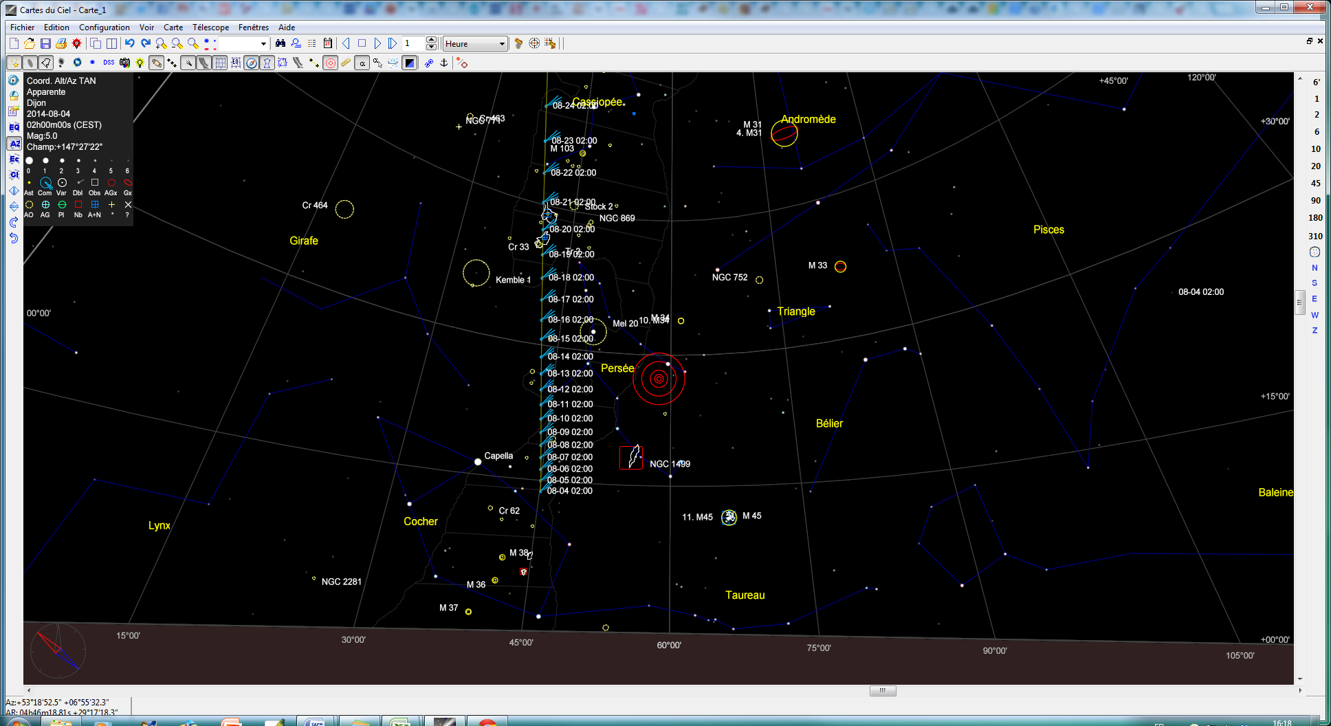 La Comète C/2014 E2 (Jacques] est à son max en ce moment ! et sera circumpolaire dès cette nuit. Elle est proche de Capella cette nuit. Il y a des chances de beau temps ce soir et demain soir; L'idéal est de l'observer après le coucher de la Lune . A partir de 2h cette nuit et à partir de 3h la nuit prochaine, voire sur le matin là où elle sera le plus haut.
