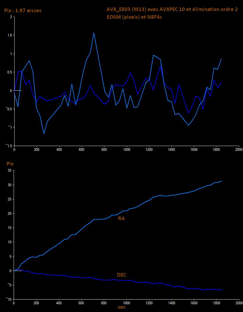 Mon idée est qu'avec la PEC et des poses unitaires, qui de toutes façons ne dépassent pas une minute (pas de saturation en photométrie !), ça doit aller. En fait j'y suis maintenant avec l' AVX. L'image de M13 est un test fait avec la courbe AVXPEC10 (similaire à P3). Les courbes P1 et P2 sont deux des relevés de la série qui a servi à établir AVXPEC10. L'autre graphique montre les restes d'erreur périodique des 50 images de 32 s de M13. Cela doit pouvoir encore être affiné. Les variations périodiques de l'AD sont un peu supérieures aux aléas de la DEC (non corrigibles). Les pixels de l' EOSM ne font que 4.3 µ.