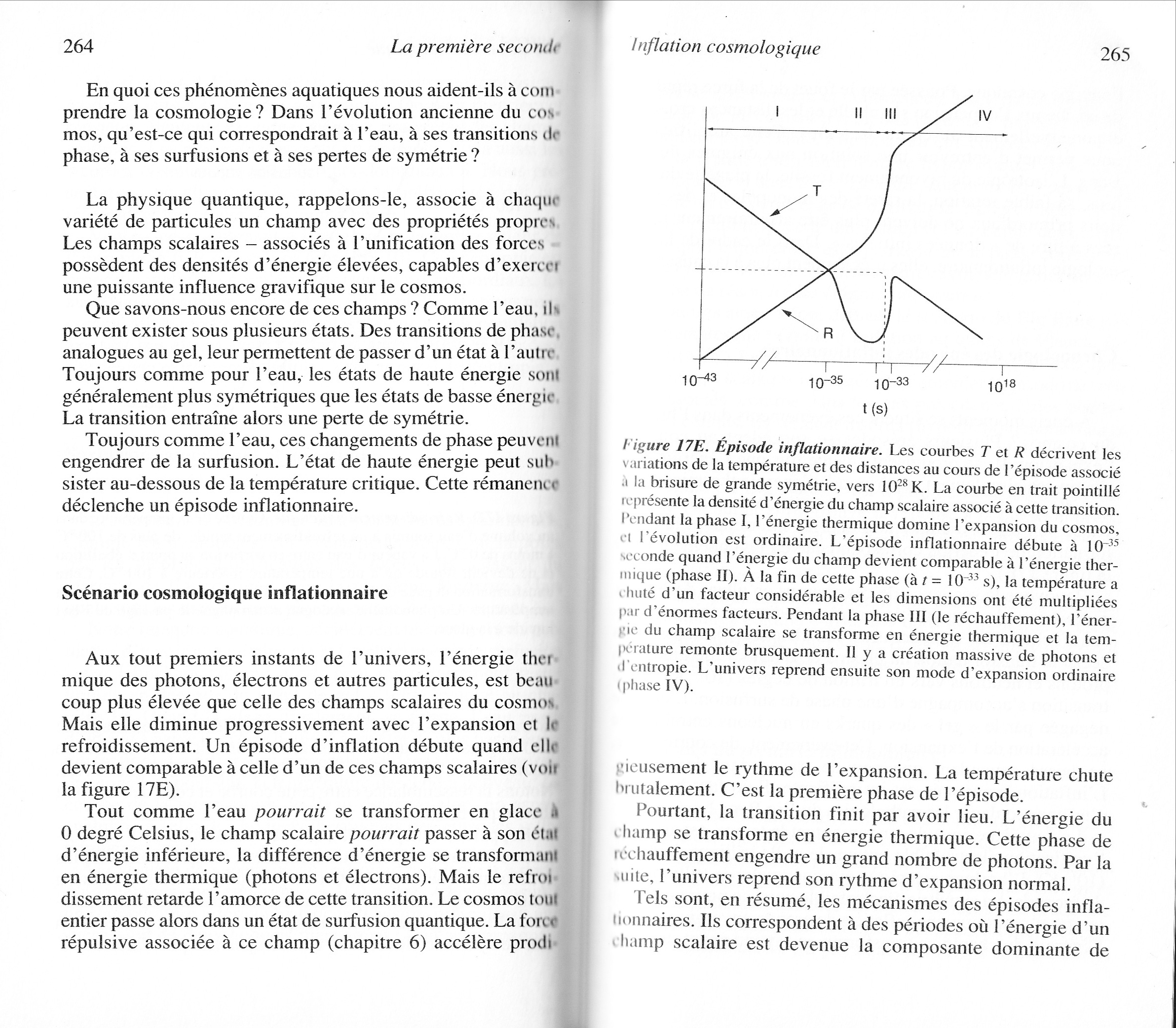Pour Christian et Gérard qui travaillent sur l'inflation et qui nous ont montré des graphiques déroutants la semaine dernière (dont un montrant l'évolution de la température, de la dimension et de l'énergie du champ scalaire de l'Univers au cours du temps), j'ai trouvé quelque chose qui pourrait peut-être être utile dans Dernières nouvelles du cosmos d'Hubert Reeves : c'est le même graphique que celui que vous nous avez montré, expliqué sur plusieurs pages...