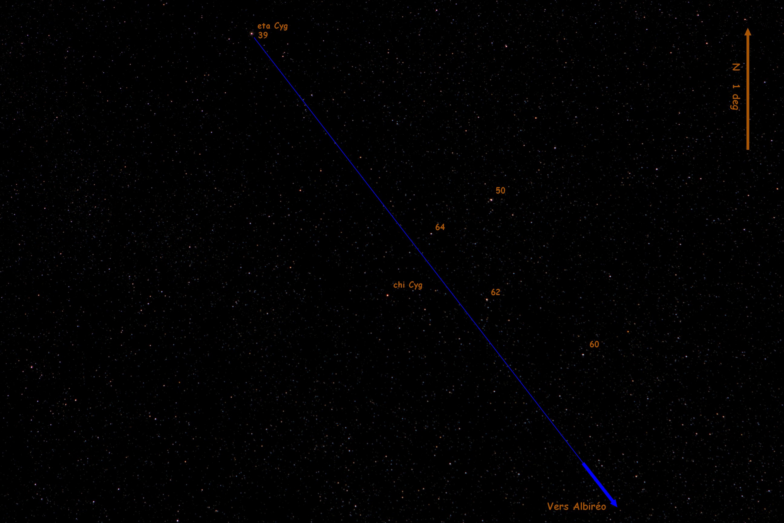 Chi Cygni est située près du cou du Cygne entre éta et Albiréo à 3 degrés de éta soit un demi champ de jumelles, facile à trouver. C'est une Mira c'est à dire une étoile variable pulsante de très grande amplitude, en gros un facteur 10 000 soit 10 magnitude. Sa période est d'environ 13.4 mois. Elle est particulièrement active cette année et pourrait arriver à mag 3 vers fin août ! Hier elle était déjà vers mag 5.5 . On devrait donc assister à une modification évidente de l'aspect de la "Northern Cross" formée par le Cygne, à l'œil nu.