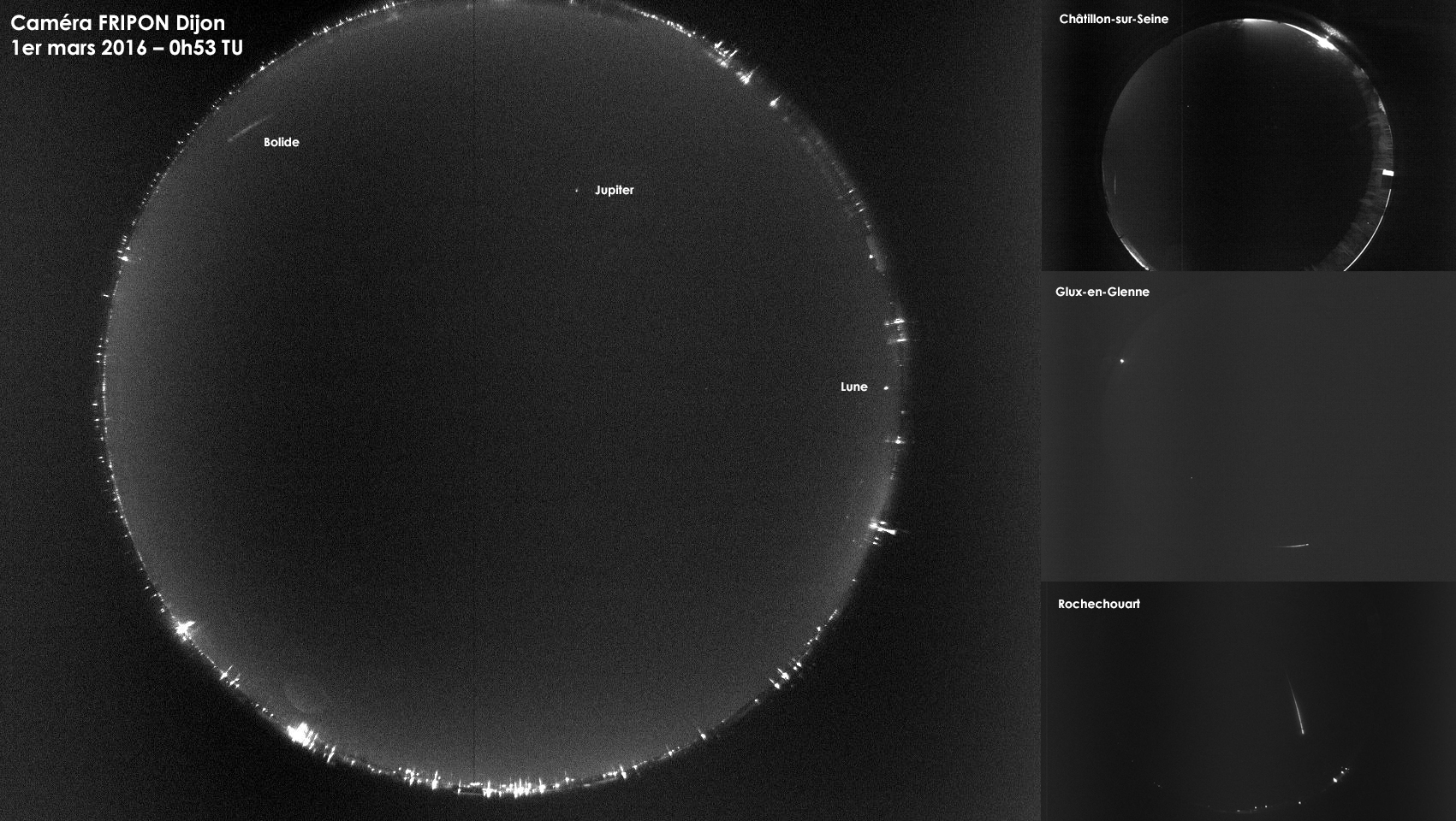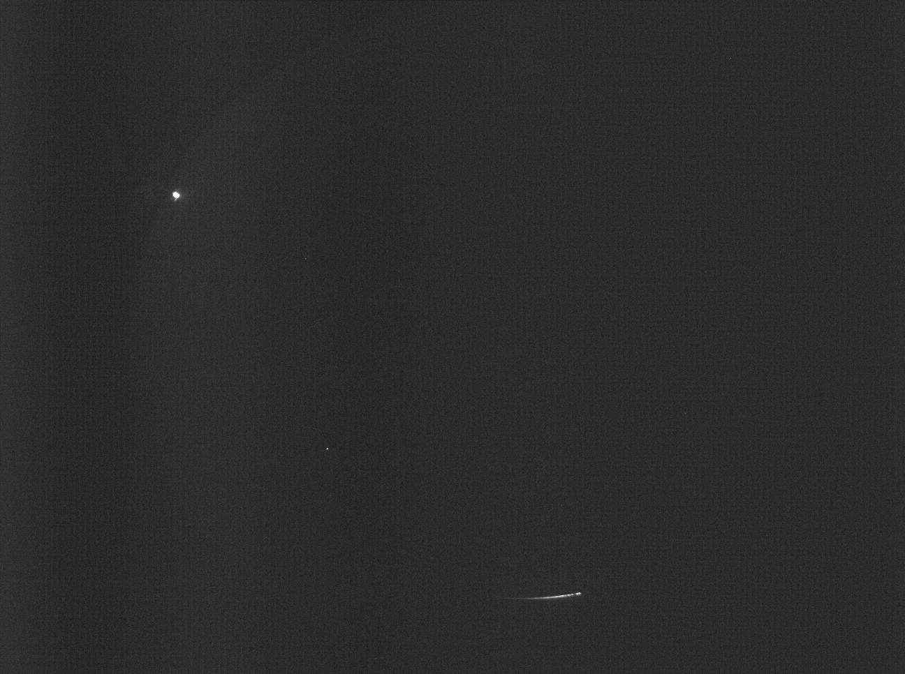 Bas sur l'horizon, certes, mais FRIPON, ça marche ! Merci à Francois Colas pour l'info et l'envoi de l'image. Le bolide est en haut à gauche, on voit également Jupiter (en haut) et la Lune qui se lève (à droite).