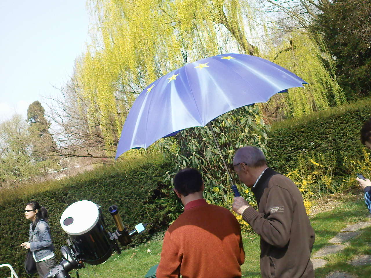 Et puis, mirâcle, vers 16h30, Vivien met l'oeil à l'oculaire de la Coronado (fixée en parallèle au C8) et il dit "Il y a une protu à 7h !". Et oui, effectivement, un jolie arche triple (si, si), très pâle, mais bien visible après réglage du filtre. Ce fut presque l'émeute. Tous les visiteurs présents ont voulu voir ... et ont vu ! Sauf Eric, parti animer une séance de plané ...