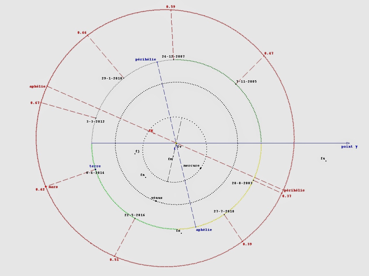 Sur le schéma, pour Mars, il y a un "fm" en noir et un "fM" en rouge. Lequel des deux correspond au deuxième foyer (l'autre foyer étant le point jaune aux intersections des droites = le Soleil, sauf erreur) ? Le fM rouge ?