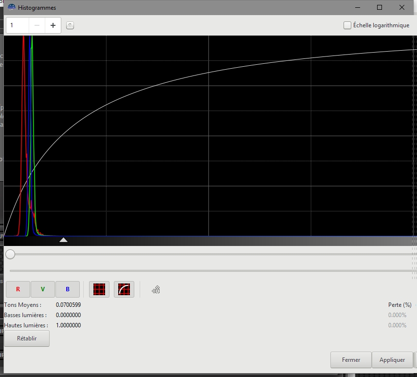 Autre question : dans cette fenêtre Histogramme, à quoi servent les boutons R V B ? Je pensais qu'ils permettraient de travailler indépendamment sur chaque canal, mais il semble qu'ils n'agissent que sur l'affichage de l'histo. On travaille sur les trois canaux, quels que soient l'état des boutons R V B. Une amélioration serait de permettre de travailler sur chaque canal, voir uniquement sur la luminance (en TSL).