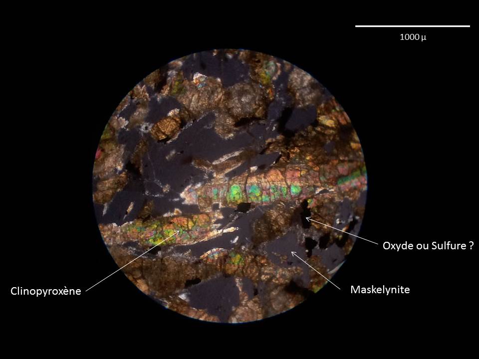 Les 2 premières sont issues d'une Shergottite martienne (basalte dont le feldspath a fondu sous le choc de l'impact, donnant de la maskélynite) et les 3 ème et 4 ème une Eucrite dite "monomicte" c'est à dire ne comprenant qu'un type de texture (micrograbbroïque) : sorte de magma issu des profondeur mais contenant des pyroxènes et des feldspaths (non fondus) venant de Vesta.