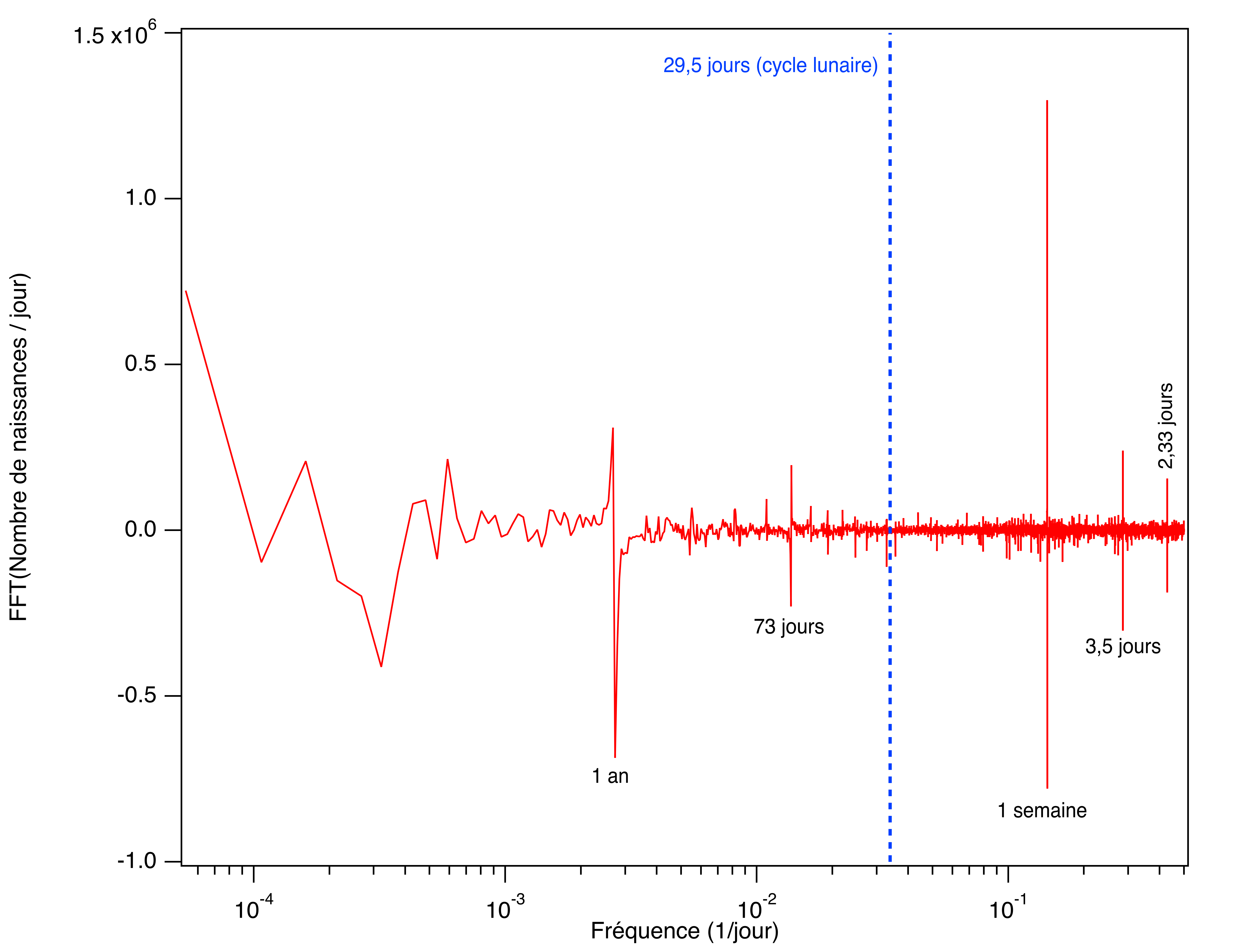 Allez, suite de la thématique "la Lune n'influence pas les naissances", cette fois via une analyse de Fourier. Si on fait la transformée de Fourier des données quotidiennes des naissances sur les 52 ans de données disponibles à l'INSEE, on obtient différentes périodes (qui s'expliquent plus ou moins), mais, fait absolument remarquable : rien, mais alors rien du tout, à la fréquence du cycle lunaire :D