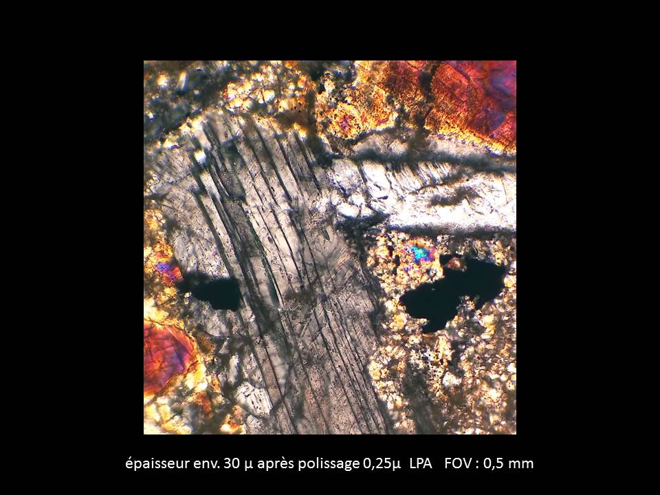 A noter sur la dernière image, des cristaux colorés qui sont striés de lignes plus sombres et qui correspondent à un phénomène dit d'exsolution (une séparation de phases minérales lors du refroidissement de la roche)