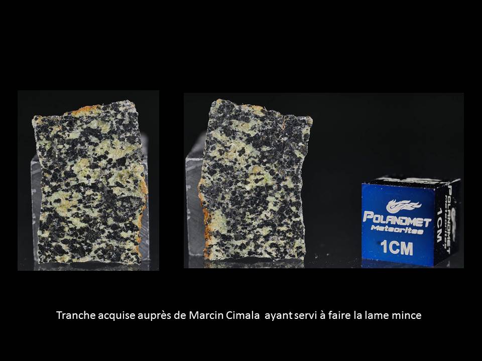 Les images ci-dessous montrent une shergottite (une des trois classes principales de météorites martiennes SNC - on oublie la quatrième ...) mais qui est différente des shergottites habituelles car elle contient une quantité importante d'olivine (ce qui n'existe pas ou très peu dans les shergottites "classiques") et d'autre part le feldspath est sur cet échantillon resté quasiment intact (dans les shergottites "classiques" le feldspath fond sous l'effet du choc - lors de l'arrachement de la roche au sol martien - et se transforme en un verre appelé maskélinite) (voir un post que j'ai fait il y a qq temps). Il s'agit de NWA 1950 (pour les passionnés vous pouvez taper : NWA 1950 et bul met et vous saurez tout sur cette météorite)