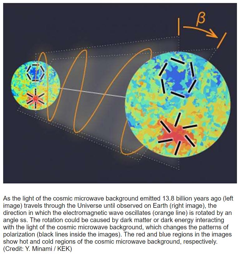 A prendre avec beaucoup de précautions. Des chercheurs ont tenter de démontrer une violation de la symétrie de parité en mesurant la polarisation des microondes du fond diffus cosmologique. Elle serait provoquée par la matière noire ou l'énergie noire.