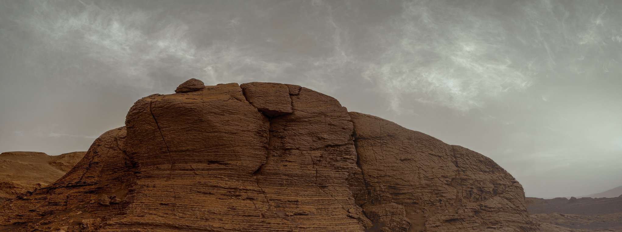Not sure which part of this image is more remarkable: the twilight clouds or the layers on that Martian rock formation!