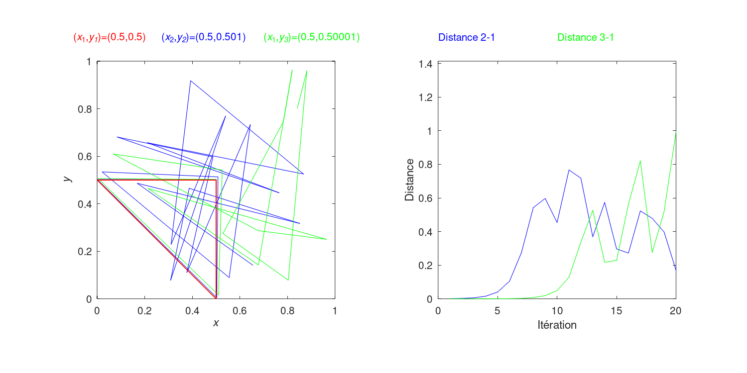 Leur position et leur distance diverge très vite complètement (le point rouge décrit simplement un triangle, alors que les points bleu et vert finissent par décrire presque tout le carré, mais de manière différente, malgré leur proximité initiale). Une belle illustration du fameux "Effet Papillon" : une toute petite différence entraîne de gros effets à long terme.