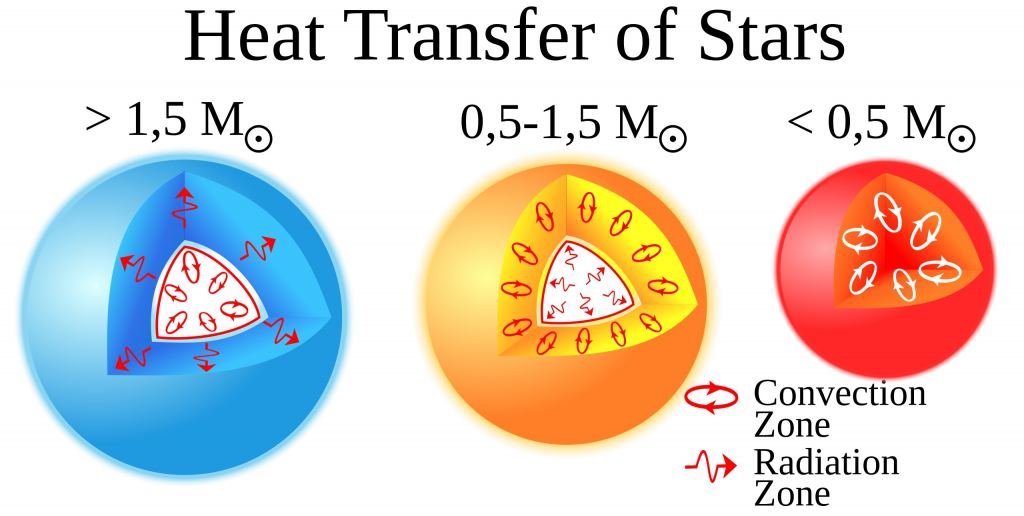 Bien que la pression interne et le poids gravitationnel d’une étoile soient généralement en équilibre, le flux de chaleur ne l’est pas. Toute la chaleur et l’énergie générées dans un noyau stellaire doivent s’échapper dans le temps, et il y a deux façons générales dont cela se produit. La première est par un échange radiatif.La seconde par un flux convectif.