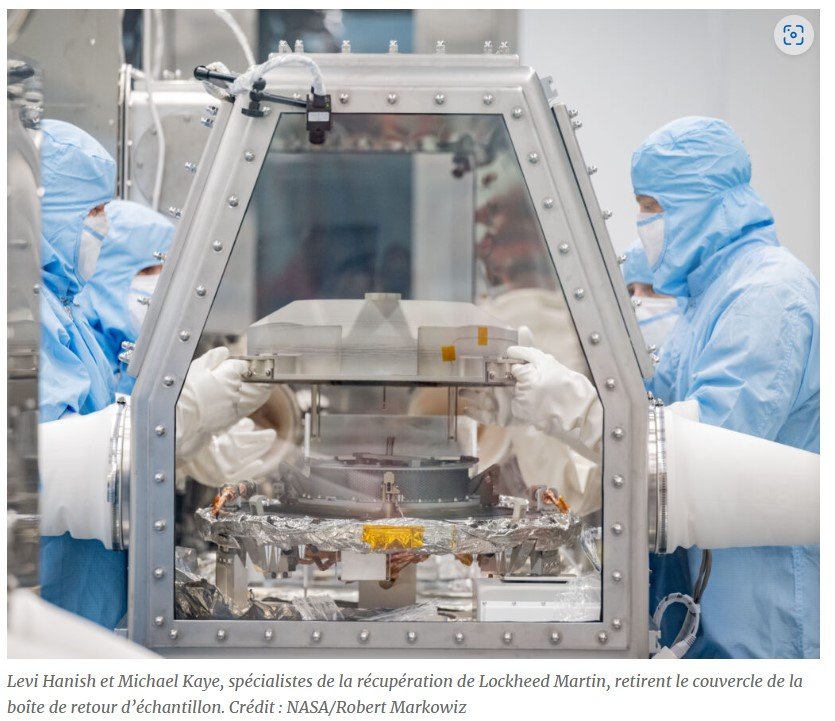 Capsule en sécurité dans une salle blanche provisoire dans l'Utah. Elle contient 250 g d'échantillons de Bennu.