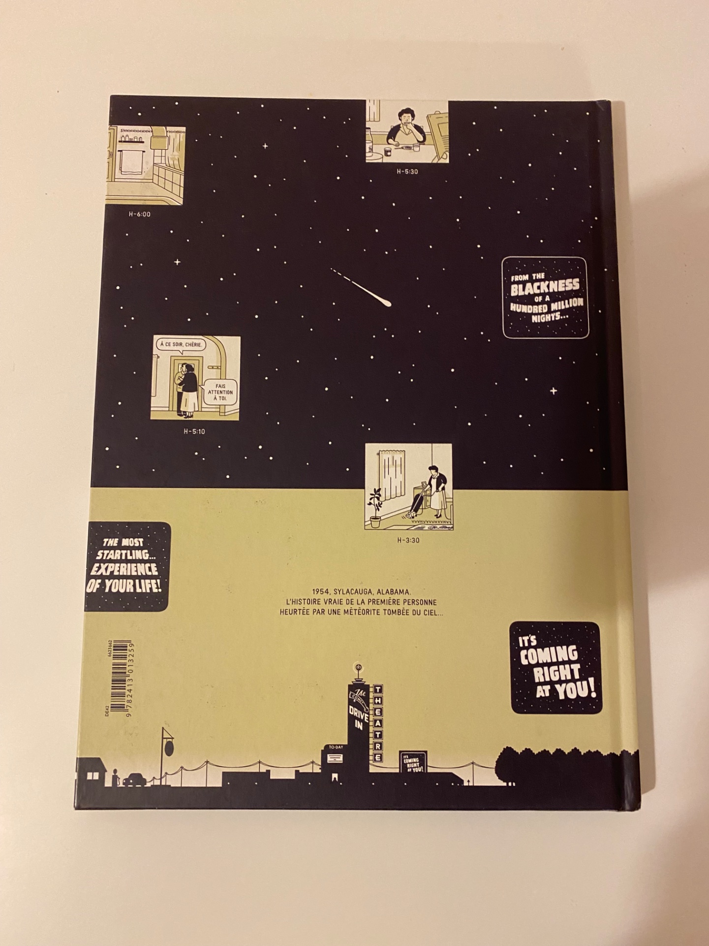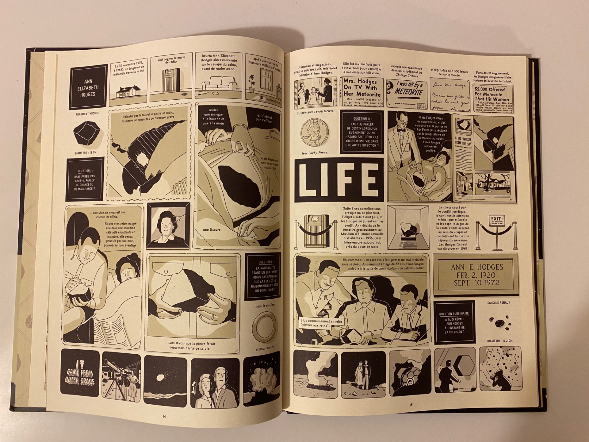 Le 30 novembre 1954, 12h45 à Sylacauga, Alabama, USA, Ann Elizabeth Hodges dort sur son canapé alors qu'une pierre tombe du ciel et traverse son toit. Elle est, à ce jour, la seule personne connue pour avoir été frappée par une météorite. Cette BD géniale et étonnante nous conte cette histoire vraie.