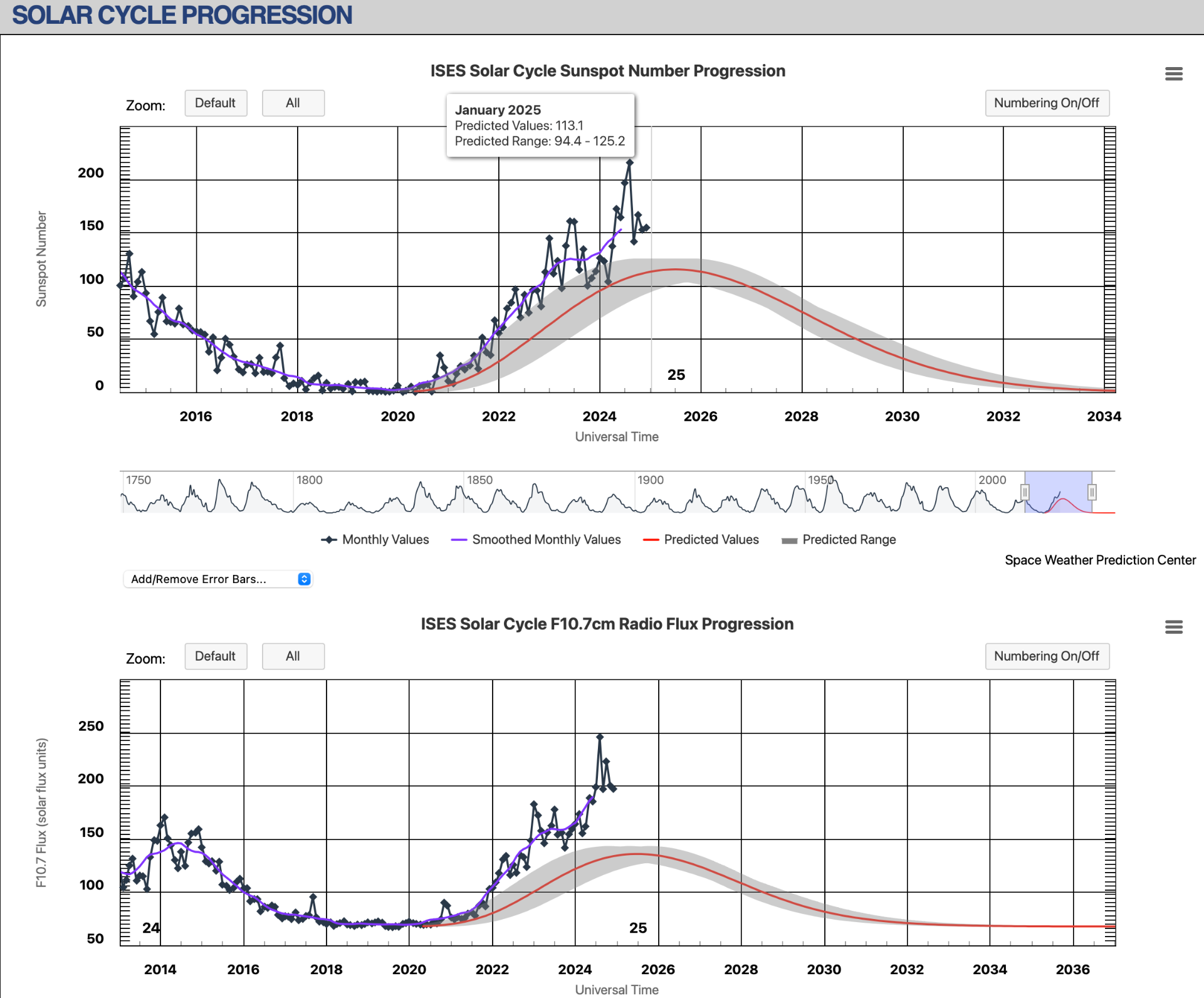 Selon le modèle utilisé (et il a l'air d'en avoir un certain nombre pour ne pas dire un nombre certain) et selon l'institut de recherche qui le produit (NASA, NCAR, ....) le maximum du cycle 25 a été passé ou pas encore.