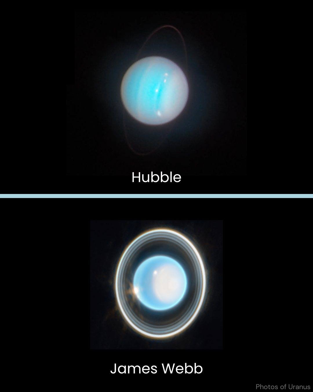 Grâce à sa vision infrarouge, le JWST voit très bien les anneaux d'Uranus, qui sont très sombres dans le visible.