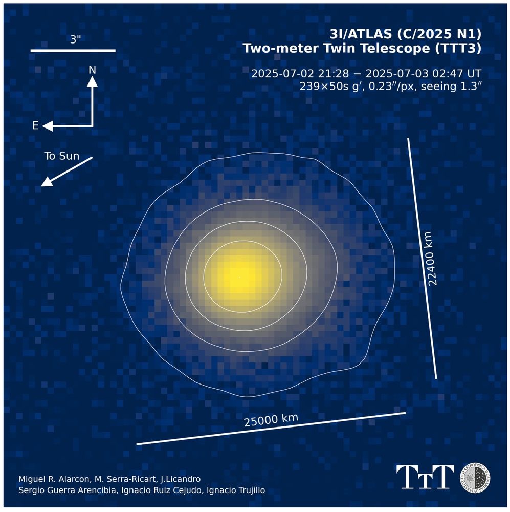 Within 24 hours, the first signs of cometary activity were reported, leading to the additional designation C/2025 N1. Currently, its estimated diameter is around 20 km, though this comes with significant uncertainty due to limited data and the object’s true brightness, which may currently be boosted by a temporary outburst.