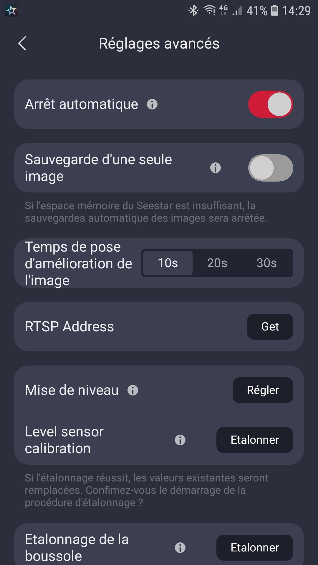 A priori , on peut accéder à un menu caché, dans l'écran de réglage, appuyer 5s sur "mon Seestar"