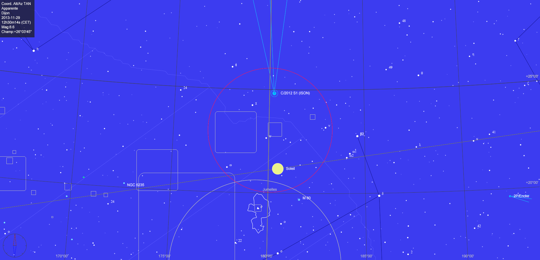 Fallacieux... A moi aussi ! C'est effectivement bien approximatif ! La trajectoire est décalée vers le soleil par rapport à celle de la NASA. Il-y-a plein d'images et d' infos bricolées, voire trompeuses, au sujet d' Ison, qui trainent sur le web, les réseaux sociaux... Personnellement je m'en tiens aux sites officiels Nasa, ESA, CIOC (le site NASA de la campagne Ison. Son blog est, je pense, la meilleure source d'interprétation au jour le jour) http://isoncampaign.org/blog