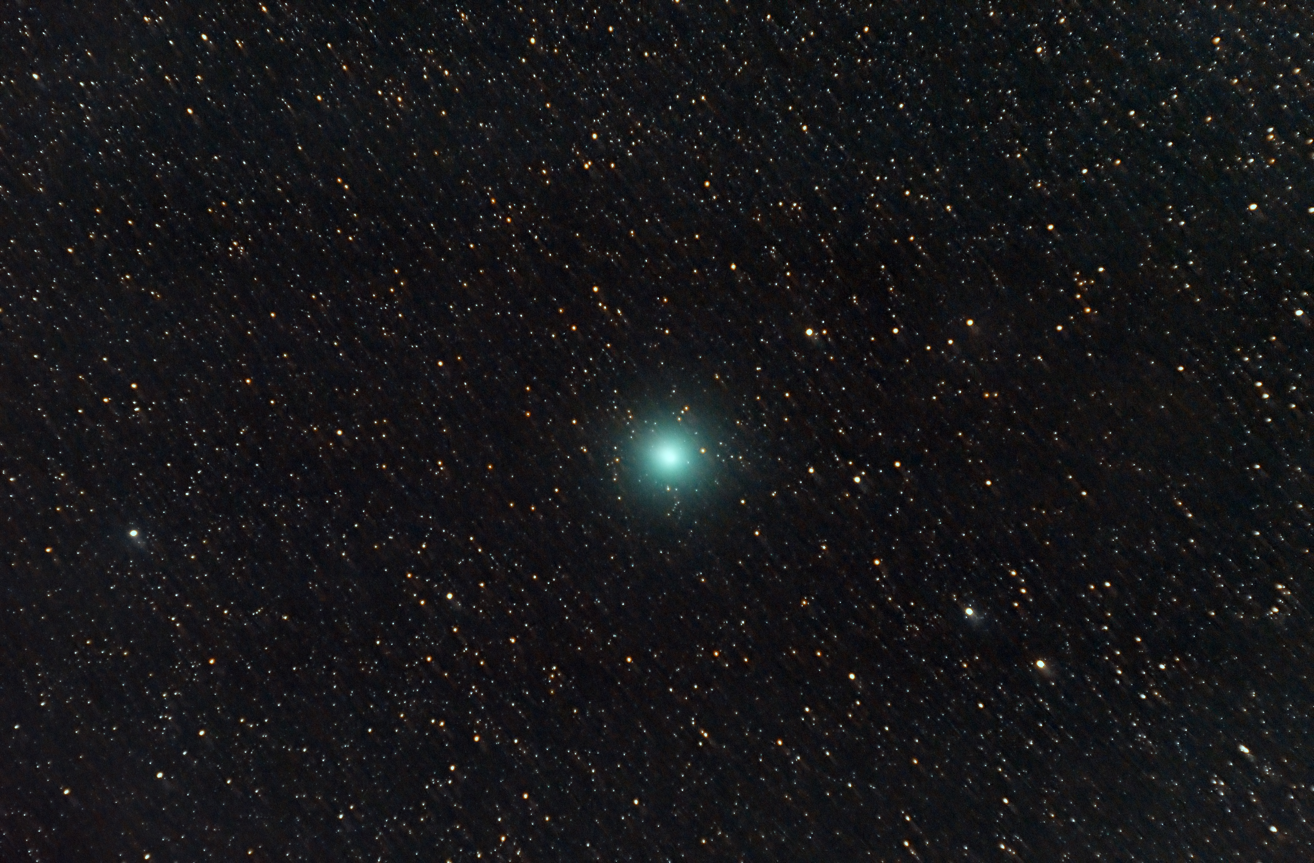 Canon 500D et objectif Sigma 85 mm sur AstroTrac, filtre UHC, 60 images de 1 mn à 800 ISO, 20 darks, 20 flats, 20 offsets, traitement Siril et Photoshop. Alignement sur la comète et alignement sur les étoiles avec rejet bas et composition des deux.