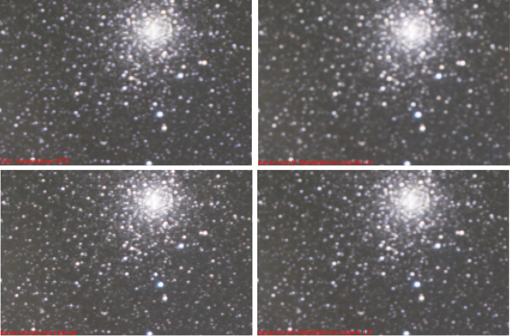 Que peut on en tirer ? En l'état, l'algo de dématriçage inclu dans Siril donne d'aussi bons résultats qu'un Bayer-Drizzle (du moins sous APP, je n'ai pas testé avec PixInsight) avec les paramètres recommandés. La version Point Kernel donne des étoiles bien plus fines, il est vrai, mais la contrepartie est une image bruitée, plus difficilement exploitable. La version de Siril est même meilleure, à mon avis, que la version APP avec les paramètres recommandés par son concepteur, à savoir Bayer-Drizzle TopHatKernel droplet 2.5.