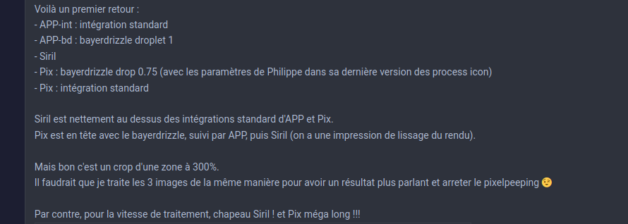 Bref, C'est une des critiques que l'on entend le plus souvent au sujet de Siril, (en plus de travailler seulement en 16bits mais ça c'est réglé dans la version de développement), de ne pas avoir de Bayer Drizzle.