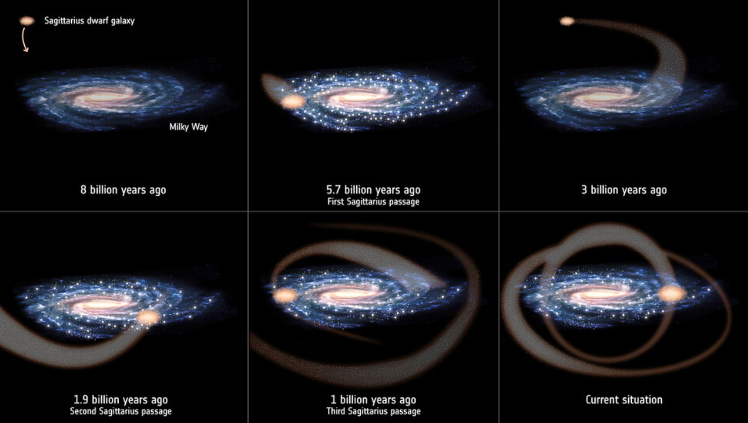 « Les modèles existants montraient que la galaxie du Sagittaire est tombée trois fois dans la Voie Lactée, une première fois il y a cinq ou six milliards d’années, une seconde il y a deux milliards d’années et enfin il y a un milliard d’années, » explique Tomás Ruiz-Lara, chercheur en astrophysique à l’Institut d’astrophysique des Canaries (IAC) situé à Ténérife, en Espagne, et auteur principal de la nouvelle étude publiée dans Nature Astronomy.