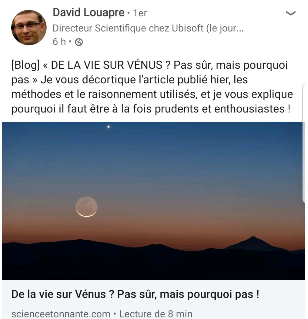 En résumé : oui on a découvert, entre autres grâce à ALMA, de la phosphine (PH3) dans les nuages de Vénus. C'est super intéressant et il faut comprendre d'où elle vient. Seulement voilà, ces chercheurs ont cru malin de surprendre leur découverte en évoquant une origine biologique. Soyons clairs, la probabilité que cette phosphine soit effectivement synthétisée par des organismes vivants et absolument infâme, si ce n'est nulle.