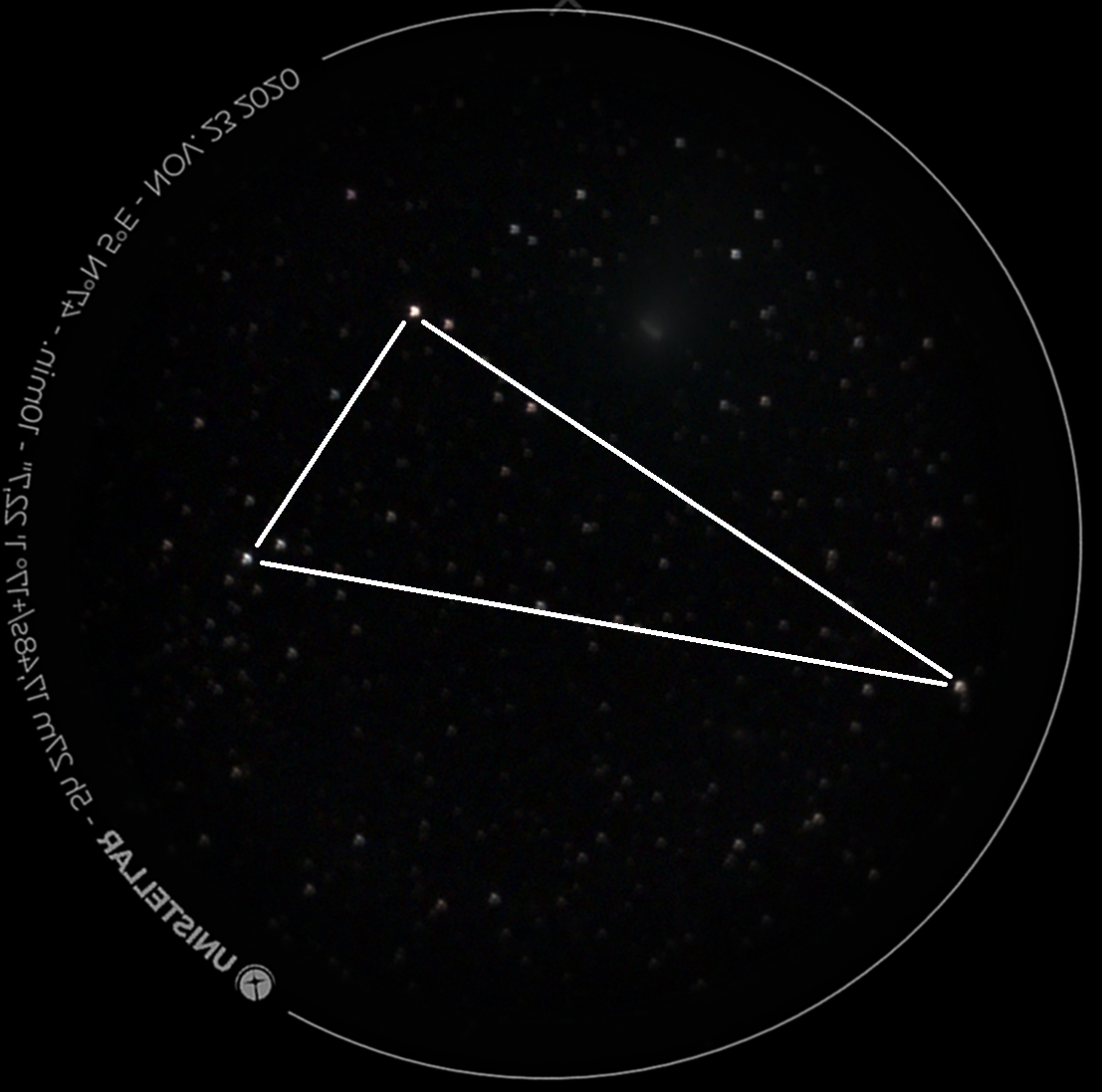 Bonsoir,Emile Touron a écrit : 05 déc. 2020 18:33 Il semble que c'est bien C/2020 M3. J'ai essayé de reproduire la scène sur Stellarium, pas évident, je ne suis pas sûr de moi !