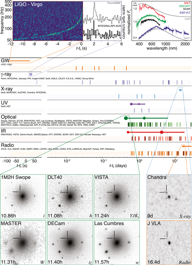 Dans les heures, jours, semaines plus tard, il a été observé des émissions d'ondes électromagnétiques couvrant tout le spectre de fréquences, X, UV, visible, IR, Radio comme le montre la photo ci dessous. 1/3 de la communauté scientifique du domaine a contribué à cette découverte et à la rédaction d'un article !!!