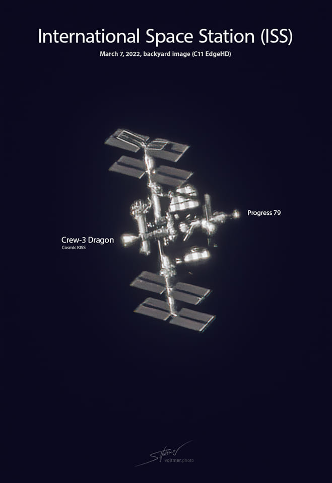 This image of the #ISS pass was taken under good seeing conditions through my C11 EdgeHD telescope from the hometown of #ESA #astronaut Dr. Matthias Maurer. The docked #SpaceX Dragon capsule, with which the astronauts of Crew-3 flew to the ISS, is clearly visible.
