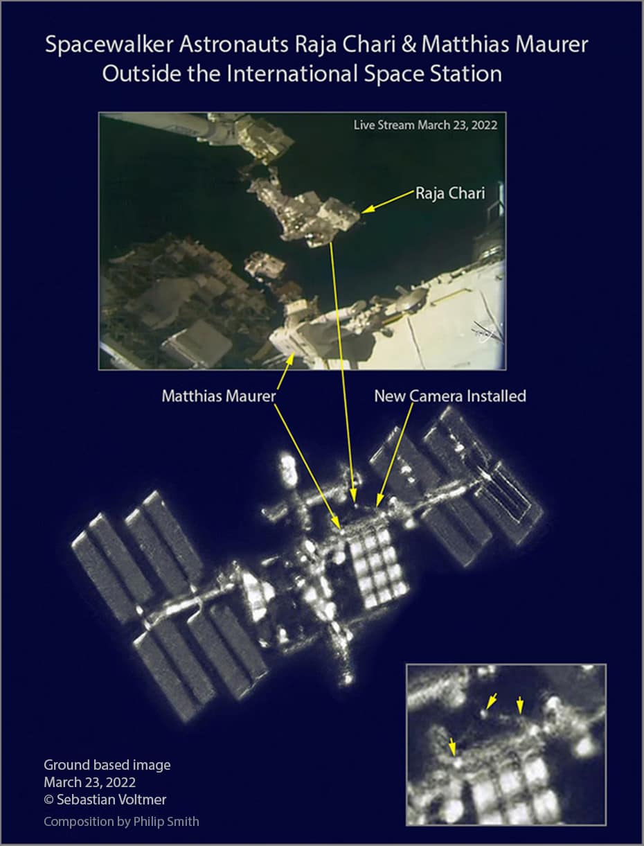 Already two days after the spacewalk happened, Philip Smith contacted me. He is a world well-known photographer of all things ISS and has been published in many forms of media. Philip Smith with his ISS obsession, noticed on my picture that NASA astronaut Raja Chari is also detectable - on the robot arm “Canadarm2” - and he created a wonderful combination picture shown here with an insert from the #NASA livestream.