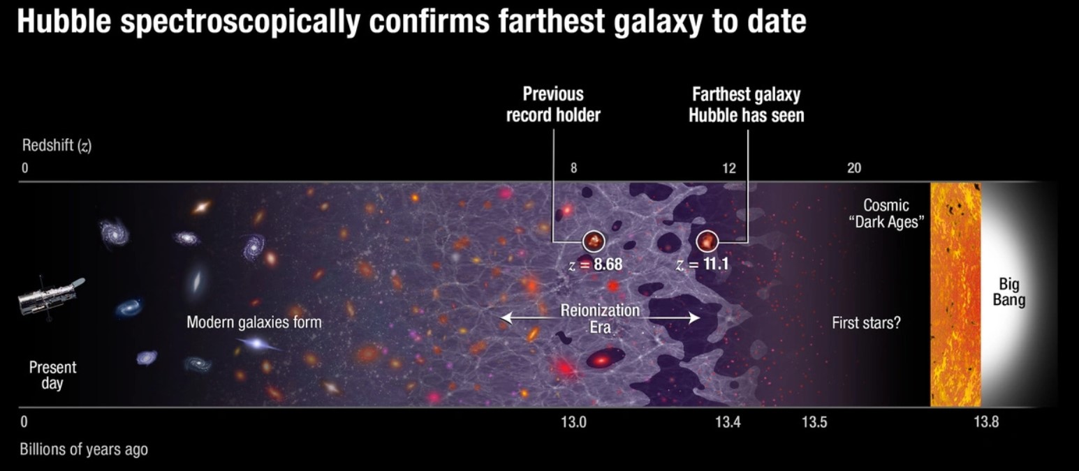 Ce n’est que parce que cette galaxie lointaine, GN-z11, est située dans une région où le milieu intergalactique est principalement réionisé, que Hubble peut nous le révéler à l’heure actuelle. Pour voir plus loin, nous avons besoin d’un meilleur observatoire, optimisé pour ce type de détection, que Hubble. Bien que la galaxie semble très rouge, cela n’est dû qu’à l’effet de décalage vers le rouge de l’Univers en expansion. Intrinsèquement, la galaxie elle-même est très bleue