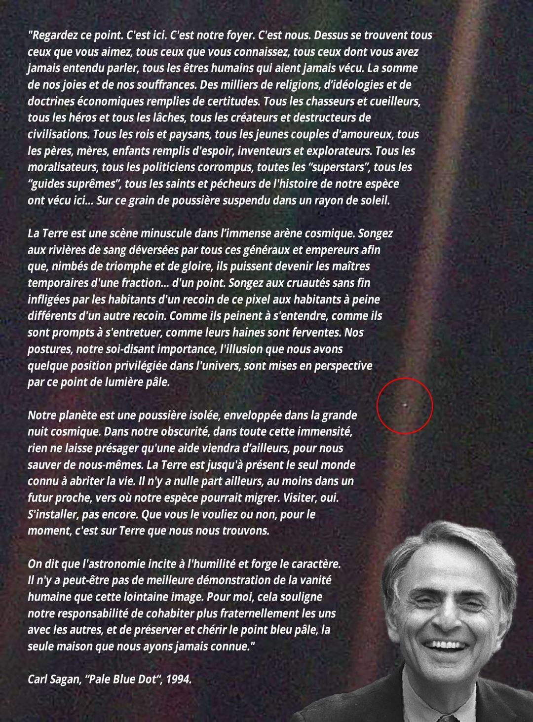 C'est l'occasion de relire à nouveau ce magnifique texte où il commente la dernière image de Voyager 2, en 1990, montrant la Terre comme un pixel bleu, vue de plus de 6 milliards de km. Texte plus que jamais d'actualité et que beaucoup devraient méditer…